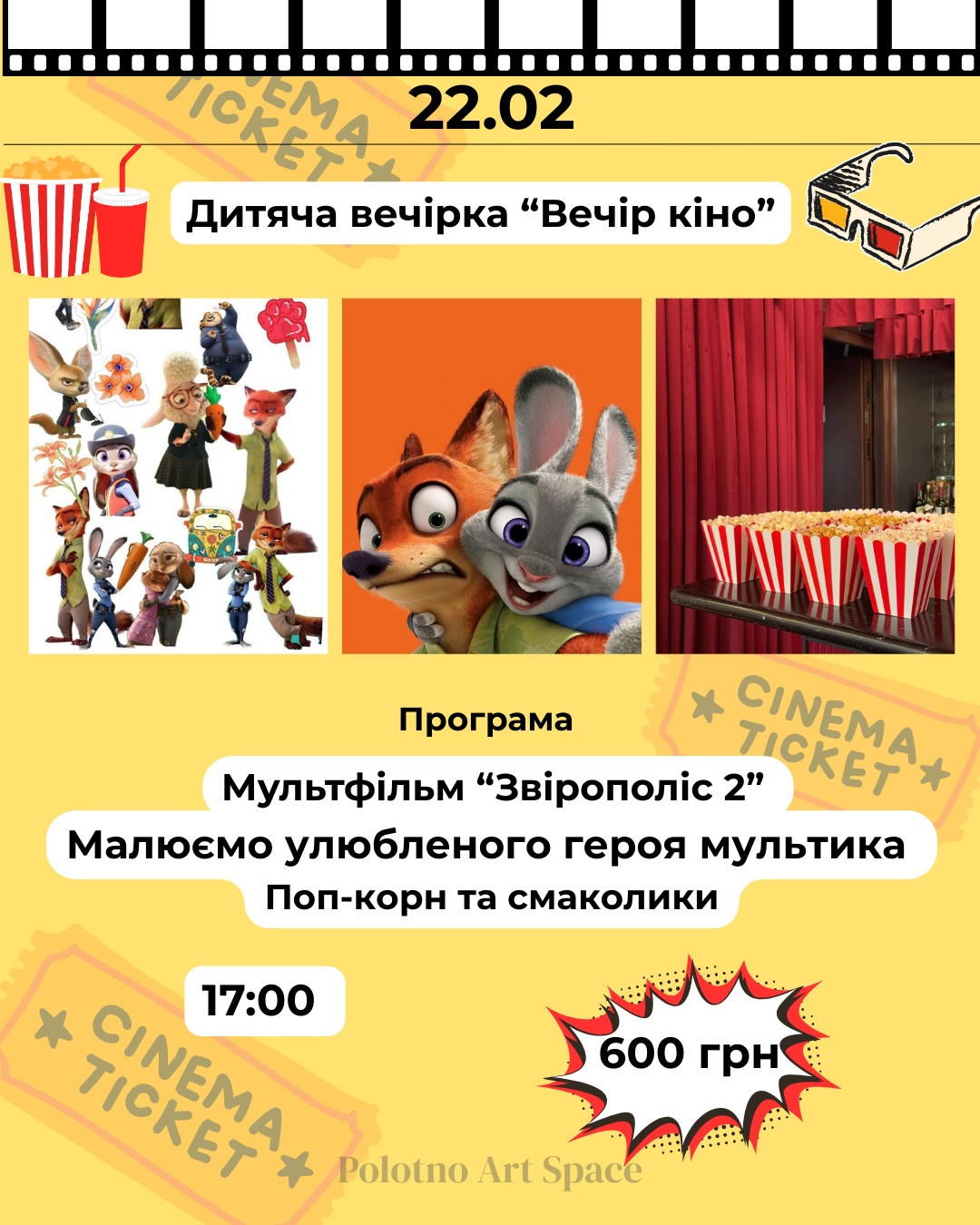 Запрошуємо на дитячу вечірку "Вечір кіно" — затишну та веселу подію для гарного настрою.