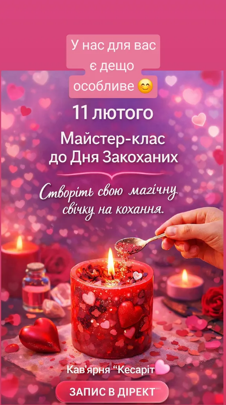 У теплій, камерній атмосфері ви створите власну свічку, наповнену намірами, ароматами та символами любові. Це не просто творчий процес, а ніжний ритуал, що допоможе зупинитись, відчути момент і наповнити серце теплом.