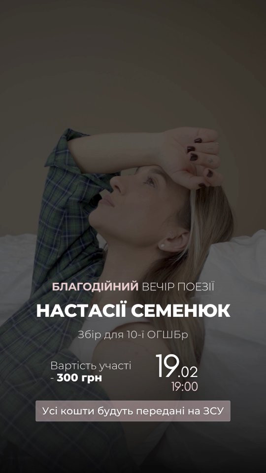 Запрошуємо вас Жити на благодійному вечорі поезії Настасії Семенюк.