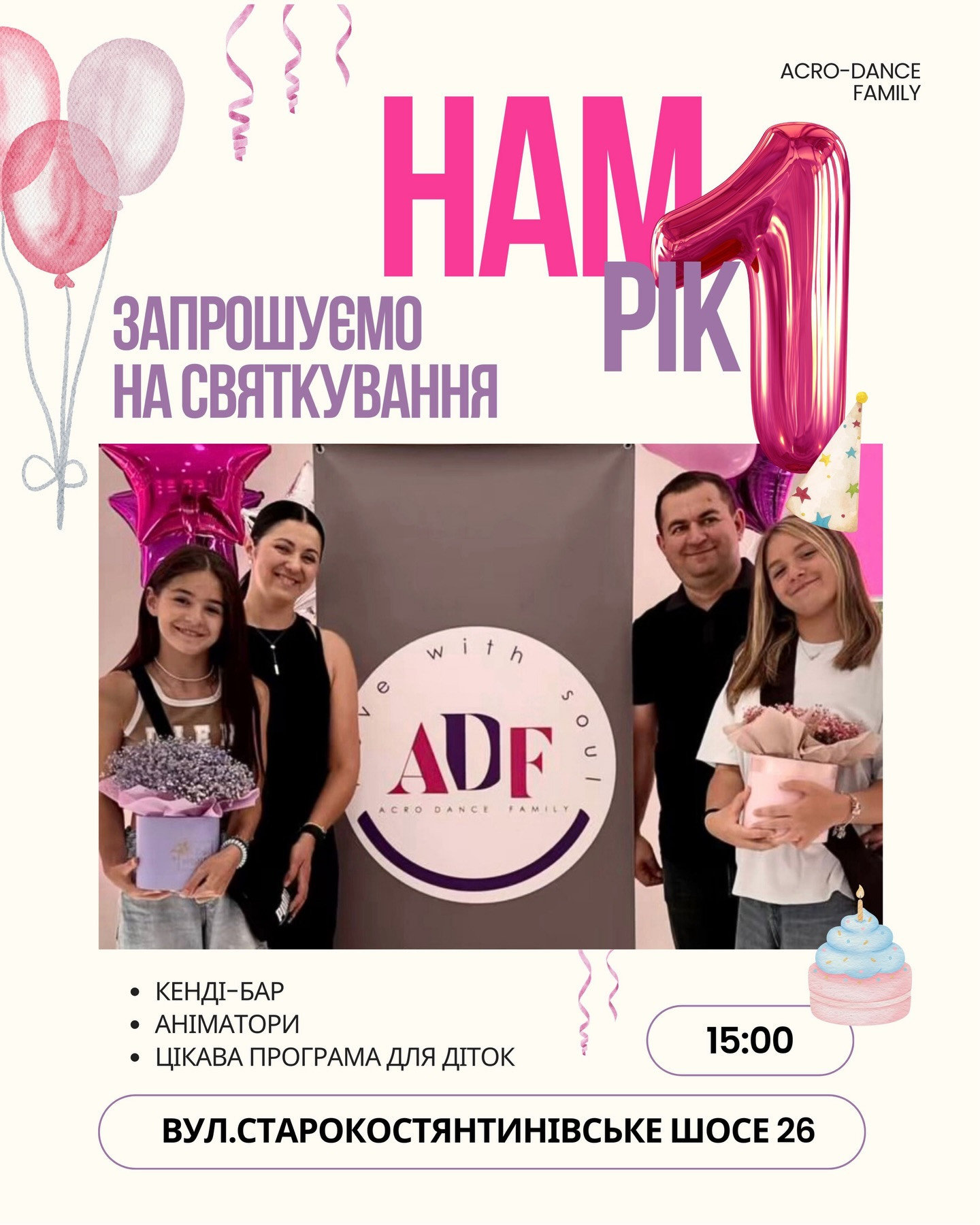Запрошуємо всіх діток, які займаються у нас і дорослих на святкування. На гостей чекає кенді-бар, аніматорська програма для малечі, інтерактиви та багато живого спілкування. Плануємо теплу атмосферу, щирі розмови й багато сміху — щоб цей день запам'ятався кожному.