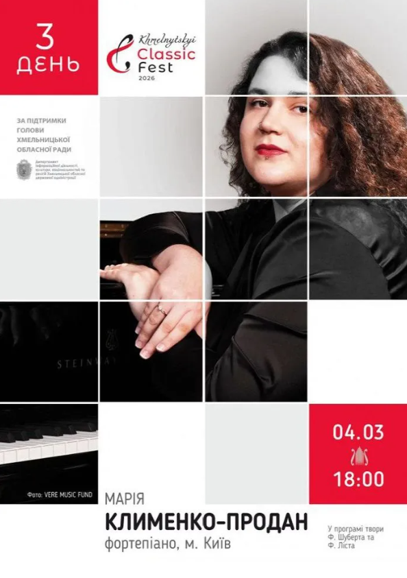Наш марафон музичних відкриттів у рамках "Khmelnytskyi Classic Fest" продовжить вечір блискучої фортепіанної музики. На вас чекає зустріч із талановитою київською піаністкою Марією Клименко-Продан.