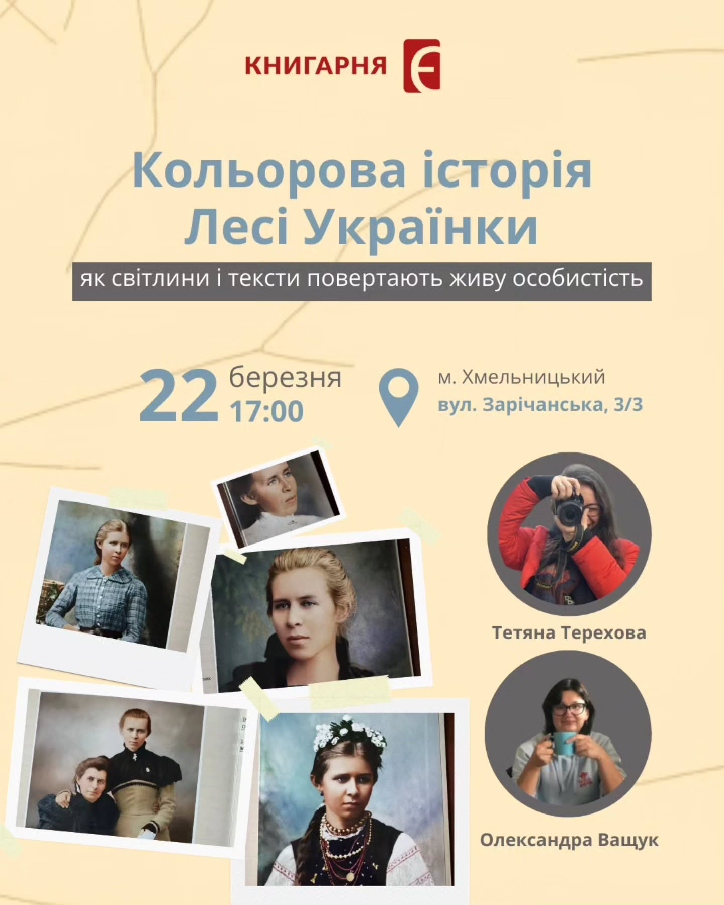 Формат події — відвертий діалог двох авторок проєкту "Кольорова історія Лесі Українки", де світлини і тексти існують не як доповнення одне до одного, а як рівноправна творча розмова.