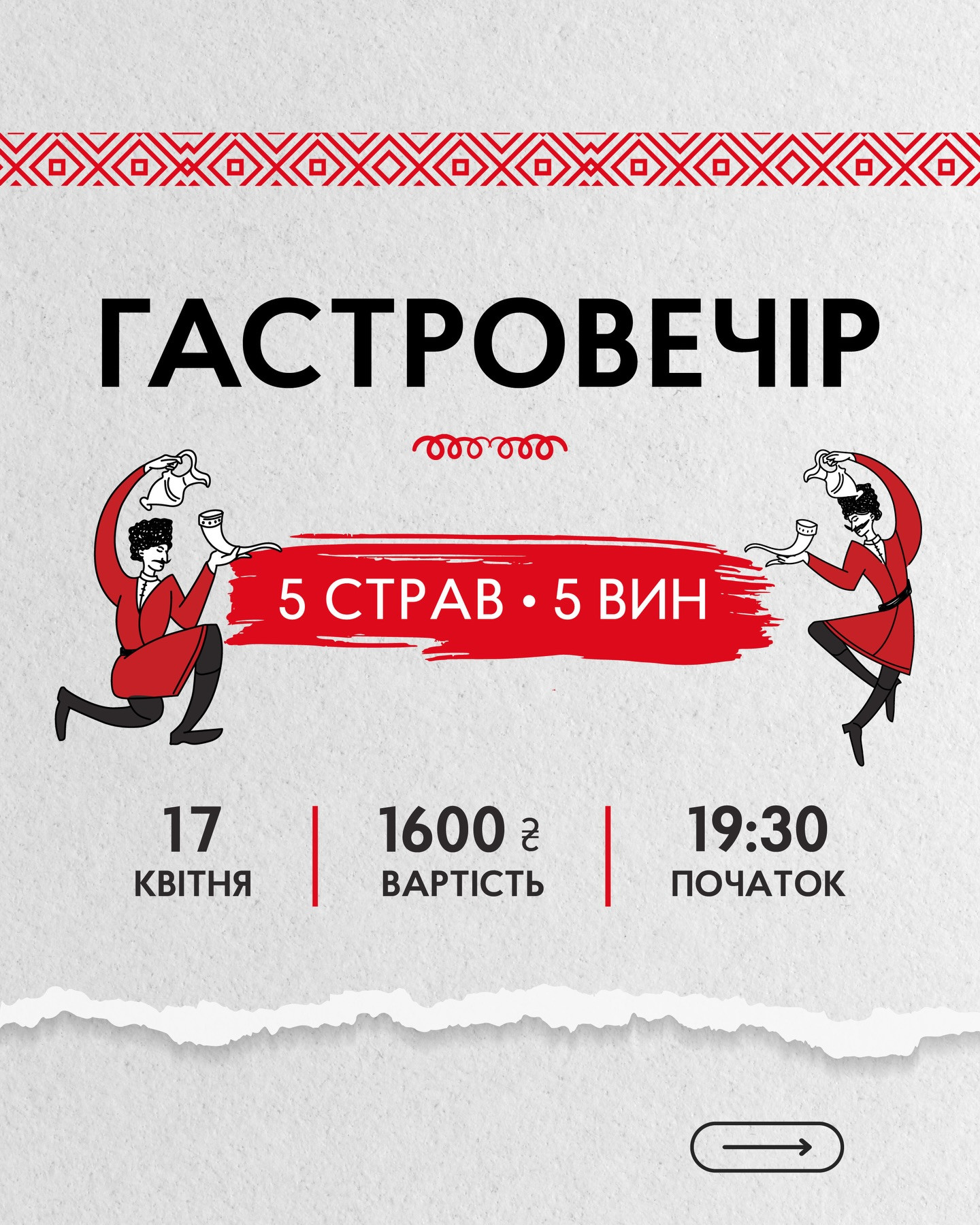 5 авторських страв у супроводі вин власного імпорту.