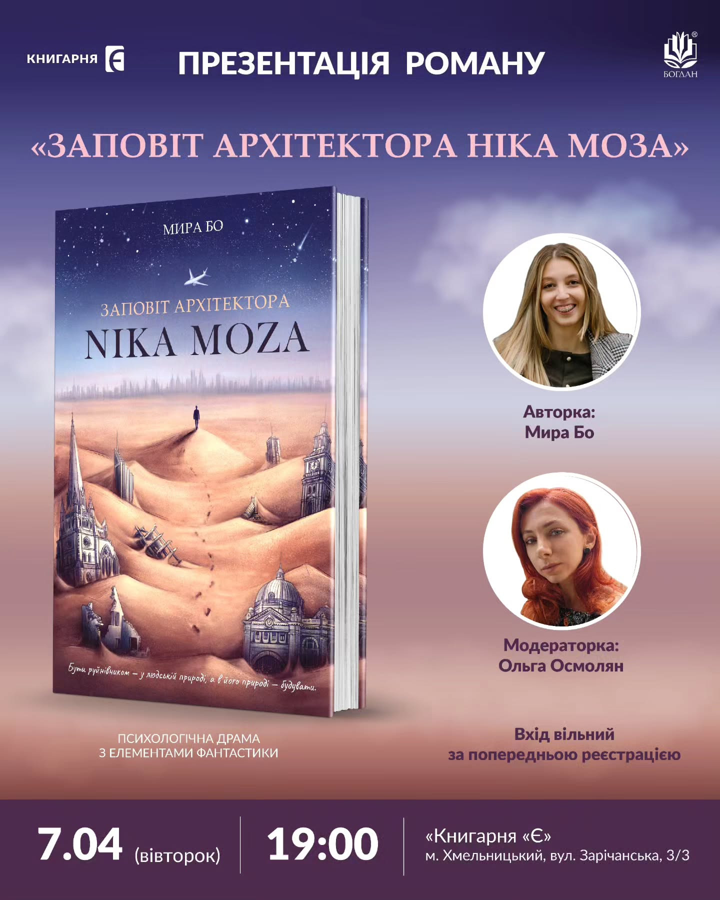 Книгарня "Є" Хмельницький та видавництво "Богдан" запрошують на презентацію психологічної драми з елементами фантастики з повною назвою: "Заповіт архітектора Ніка Моза, або Історія народження големів".