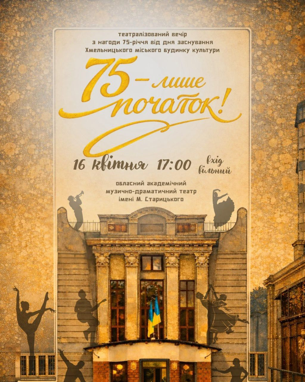 Запрошуємо вас на особливу подію для нашого Хмельницький міський будинок культури - театралізований вечір з нагоди 75-річчя від дня заснування хмельницького міського будинку культури.
