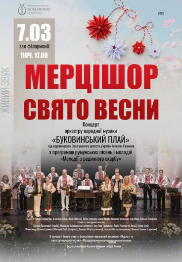 Оркестр народної музики "Буковинський плай" під керівництвом Заслуженого артиста України Миколи Гакмана представить программу румунських пісень і мелодій "Мелодії з родинного скарбу".