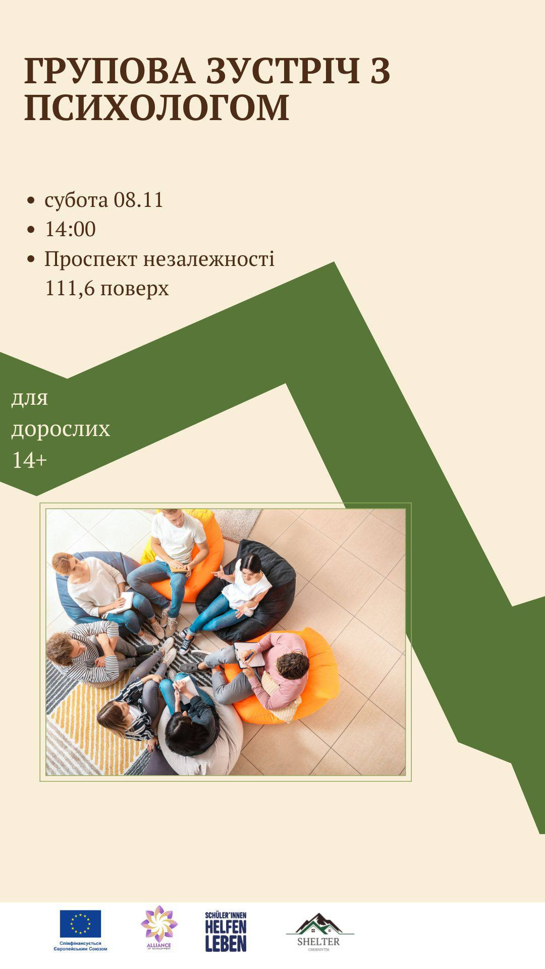 Запрошуємо вас на групову зустріч з психологом, де будемо обговорювати важливі питання.