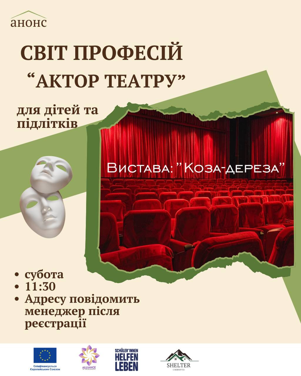 Запрошуємо дітей та підлітків у чарівний світ театру. Цього разу ми разом відвідаємо виставу "Коза-Дереза" — яскраву, добру та пізнавальну театральну постановку для дітей.