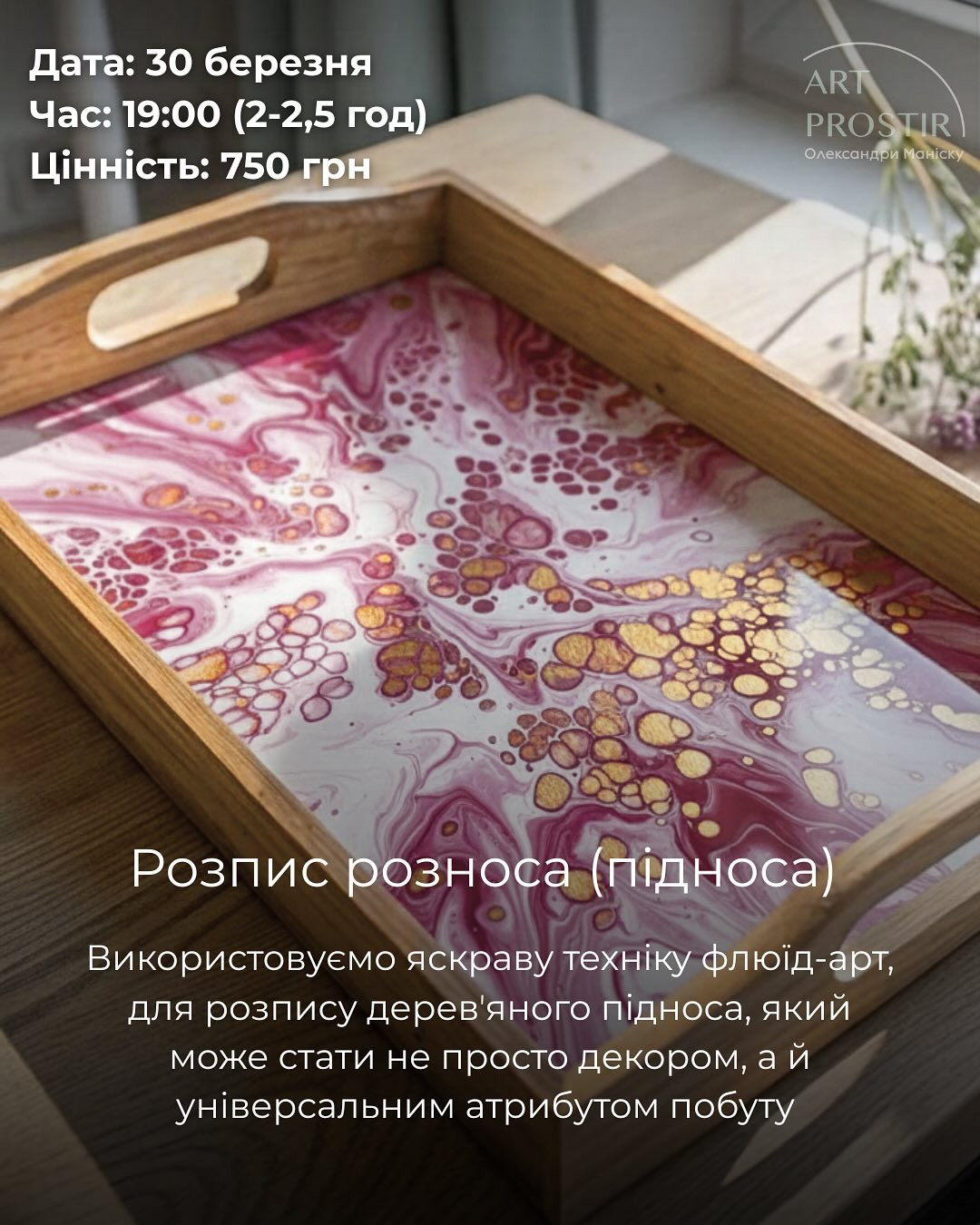 Використовуємо яскраву техніку флюїд-арт для розпису дерев'яного підноса, який стане не просто декором, а й універсальним атрибутом побуту.
