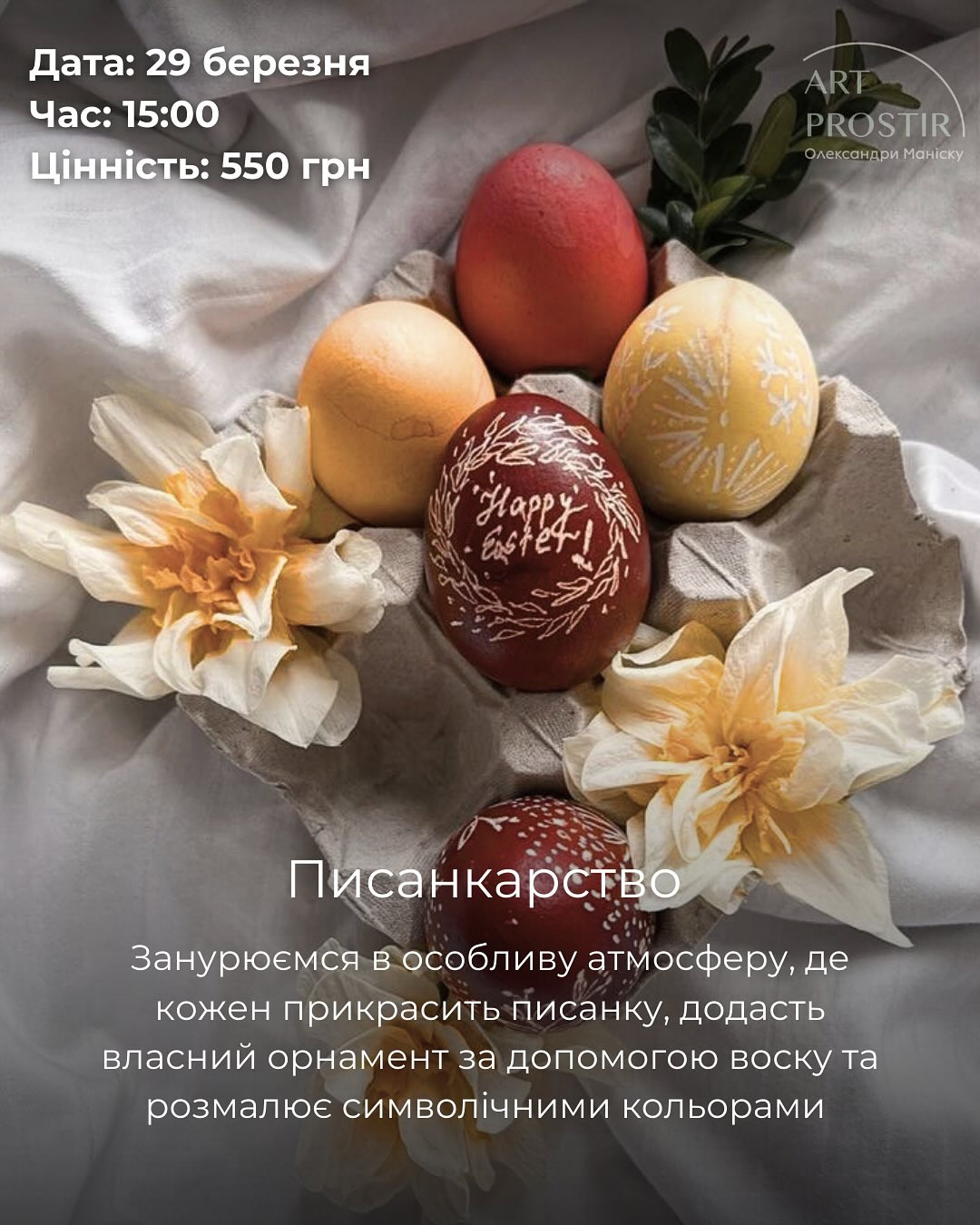 Занурюємся в особливу атмосферу, де кожен прикрасить писанку, додасть власний орнамент за допомогою воску та розмалює символічними кольорами.