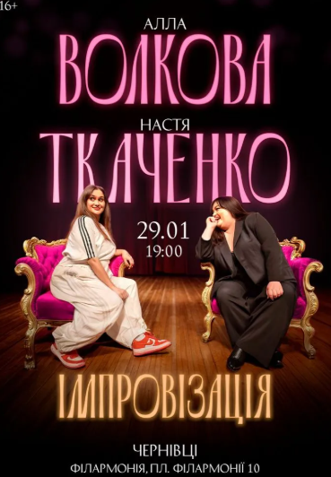 Вечір Імпровізації Алли Волкової та Насті Ткаченко - це незабутня подія для всіх, живе спілкування та справжні емоції. Алла Волкова та Настя Ткаченко будуть імпровізувати на сцені удвох.