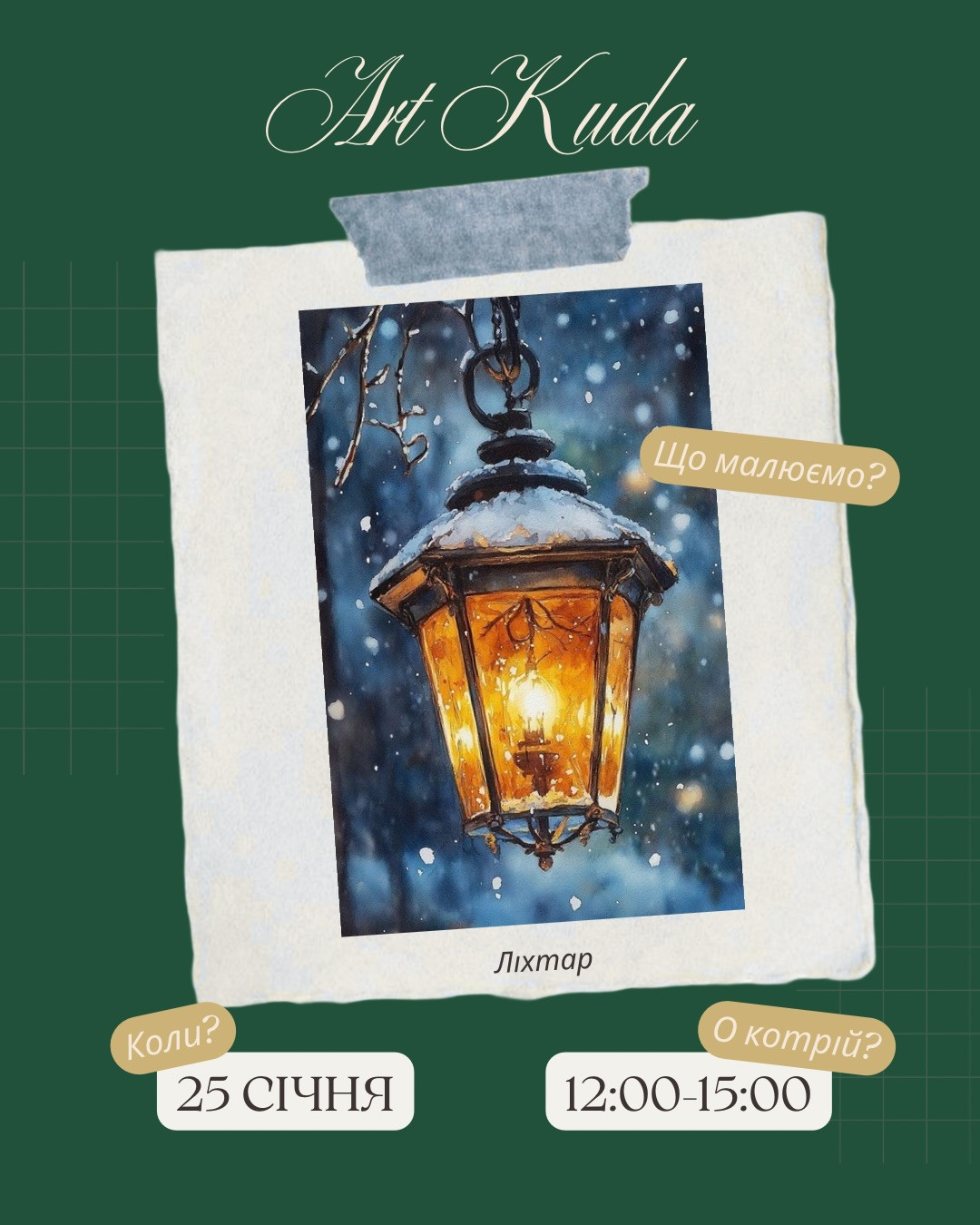 Ви не просто поринете у світ олійних фарб та створите за 3 години готову картину зимового ліхтаря, але й відпочинете душею у естетичній затишній атмосфері.