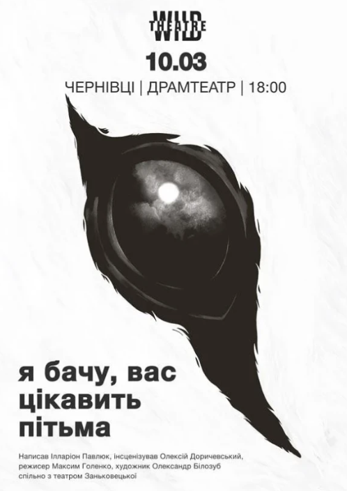 "Дикий театр" у співпраці з Національним театром ім.Марії Заньковецької представляє виставу за романом Ілларіона Павлюка "Я бачу, вас цікавить пітьма".