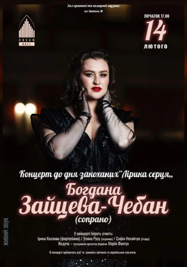В День Закоханих, у залі органної та камерної музики – БОГДАНА ЗАЙЦЕВА-ЧЕБАН - з концертною програмою ЛІРИКА СЕРЦЯ.