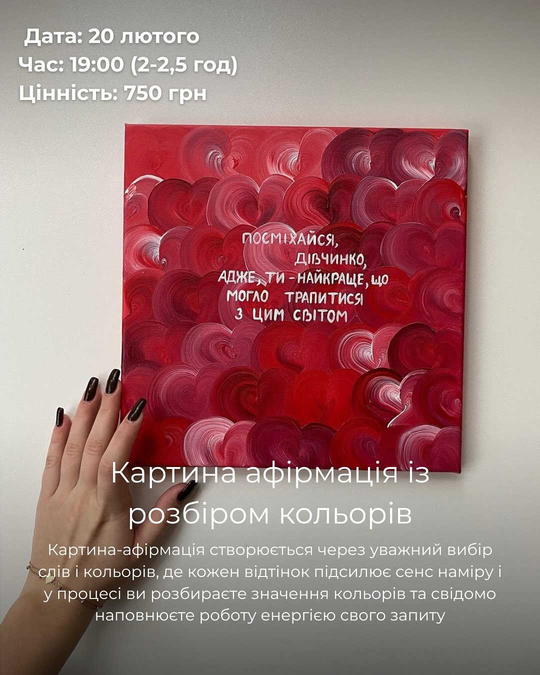 Картина-афірмація створюється через уважний вибір слів і кольорів: кожен відтінок підсилює сенс наміру, а в процесі ви розбираєте значення кольорів і свідомо наповнюєте роботу енергією свого запиту.