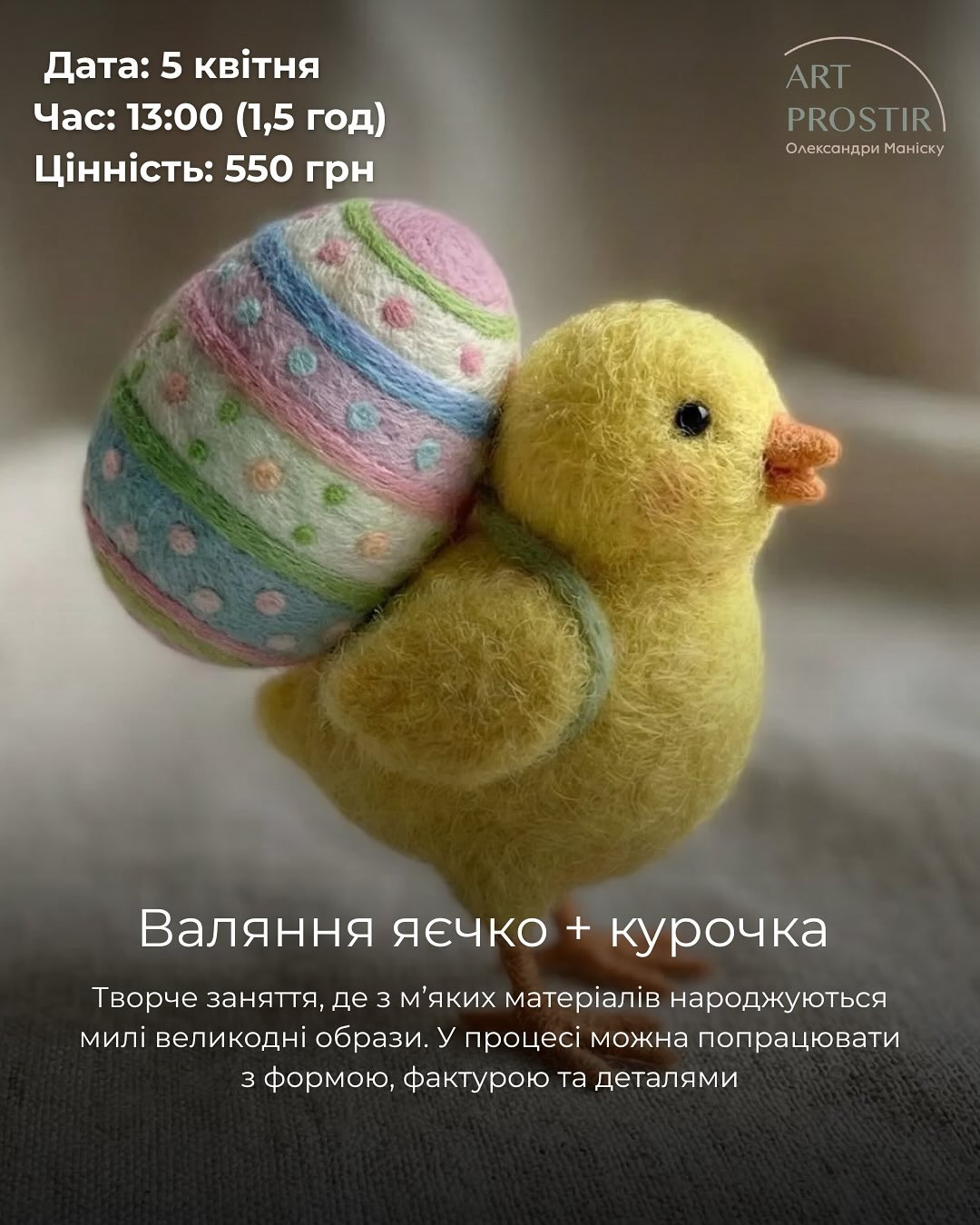 Творче заняття, де з м’яких матеріалів народжуються милі великодні образи. У процесі попрацюємо з формою, фактурою та деталями.