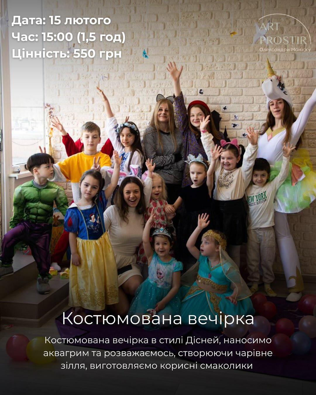 Костюмована вечірка Disney: розваги, аквагрим, чарівне зілля та виготовлення дітками корисних смаколиків.