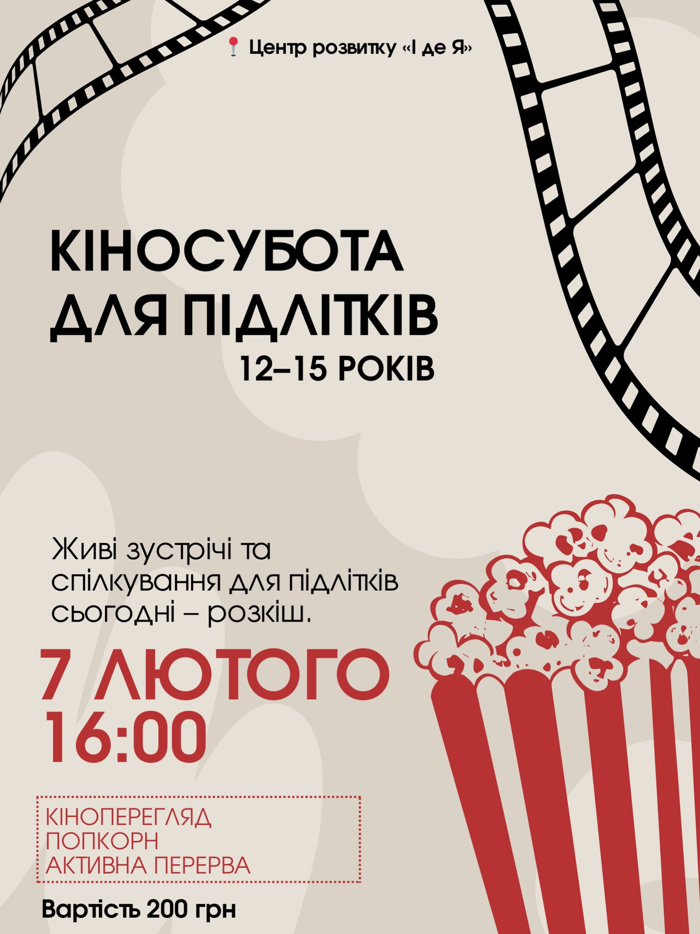 Тому ми запускаємо Кіносуботу для підлітків 12–15 років – формат, де є спільний кіноперегляд, попкорн і активна перерва для руху та живого контакту.