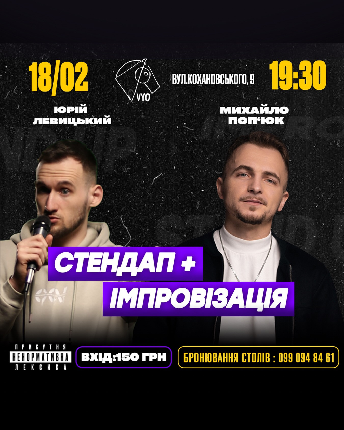 СТЕНДАП+ІМПРОВІЗАЦІЯ, де два досвідчені коміки Юрій Левицький @yur0n.electr0n та Михайло Поп’юк @misha_popiuk презентуватимуть для вас свої відбірні жарти, а також в кінці вечора поспілкуються із гостями в залі задля створення гумору тут і зараз.