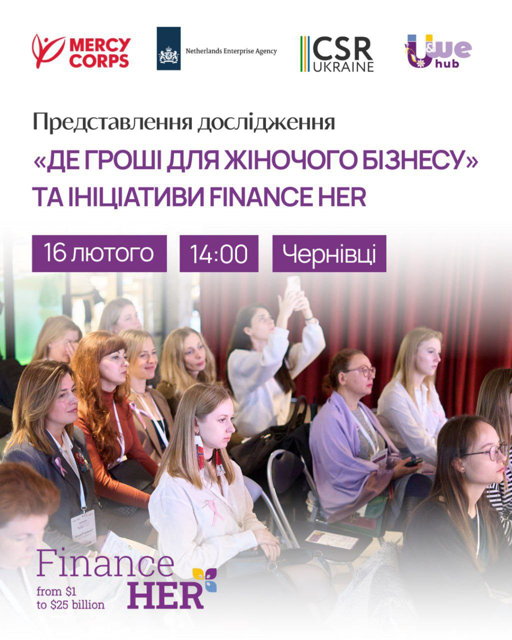 Запрошуємо на презентацію загальнонаціонального дослідження FinanceHer (Центр "Розвиток КСВ" у межах U&WE HUB за підтримки Mercy Corps).