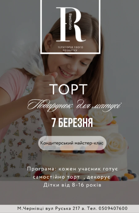 Запрошуємо діток 8-16 років на незабутній Майстер-клас з приготування торта!