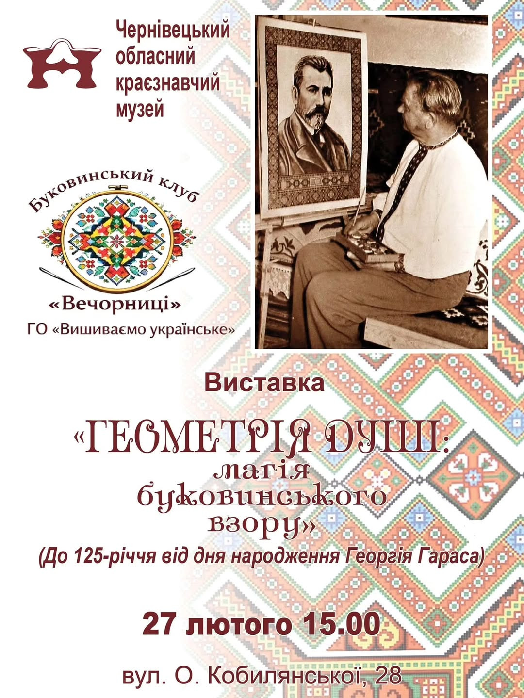 Запрошуємо на відкриття виставки "Геометрія душі: магія буковинського взору", присвяченої 125-річчю від дня народження Георгія Гараса – видатного художника-орнаменталіста, заслуженого майстра народної творчості України.