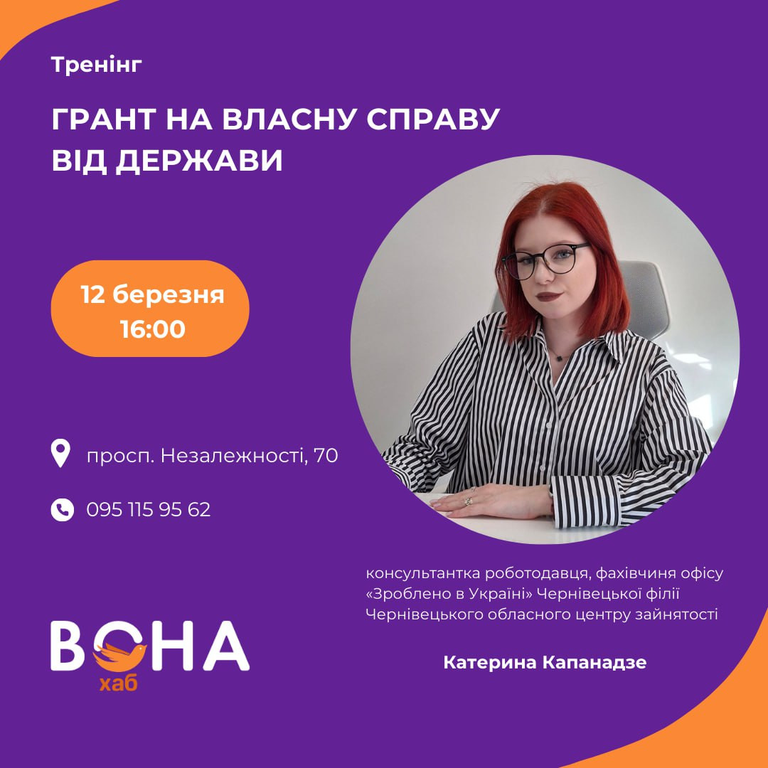 Запрошуємо на тренінг "Грант на власну справу від держави" у "ВОНА хаб" спільно з Чернівецькою філією Чернівецького обласного центру зайнятості.