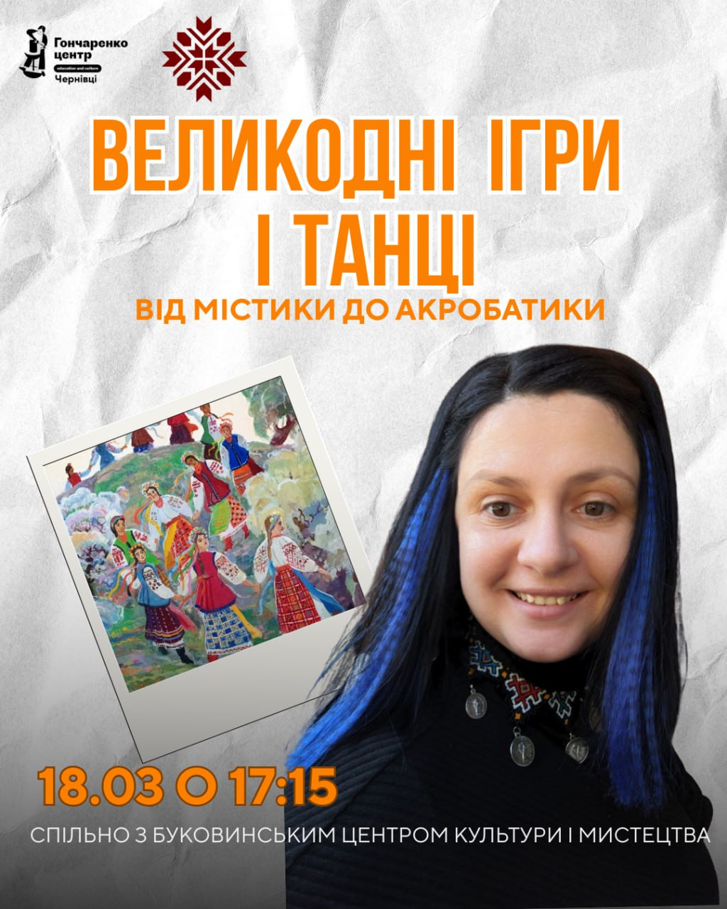 Запрошуємо на захопливу зустріч, присвячену традиціям святкування Великодня на Буковині. Під час події говоритимемо про давні великодні ігри, танці та обряди — від містичних вірувань до енергійних забав і навіть акробатичних елементів, які колись були невід’ємною частиною святкувань.