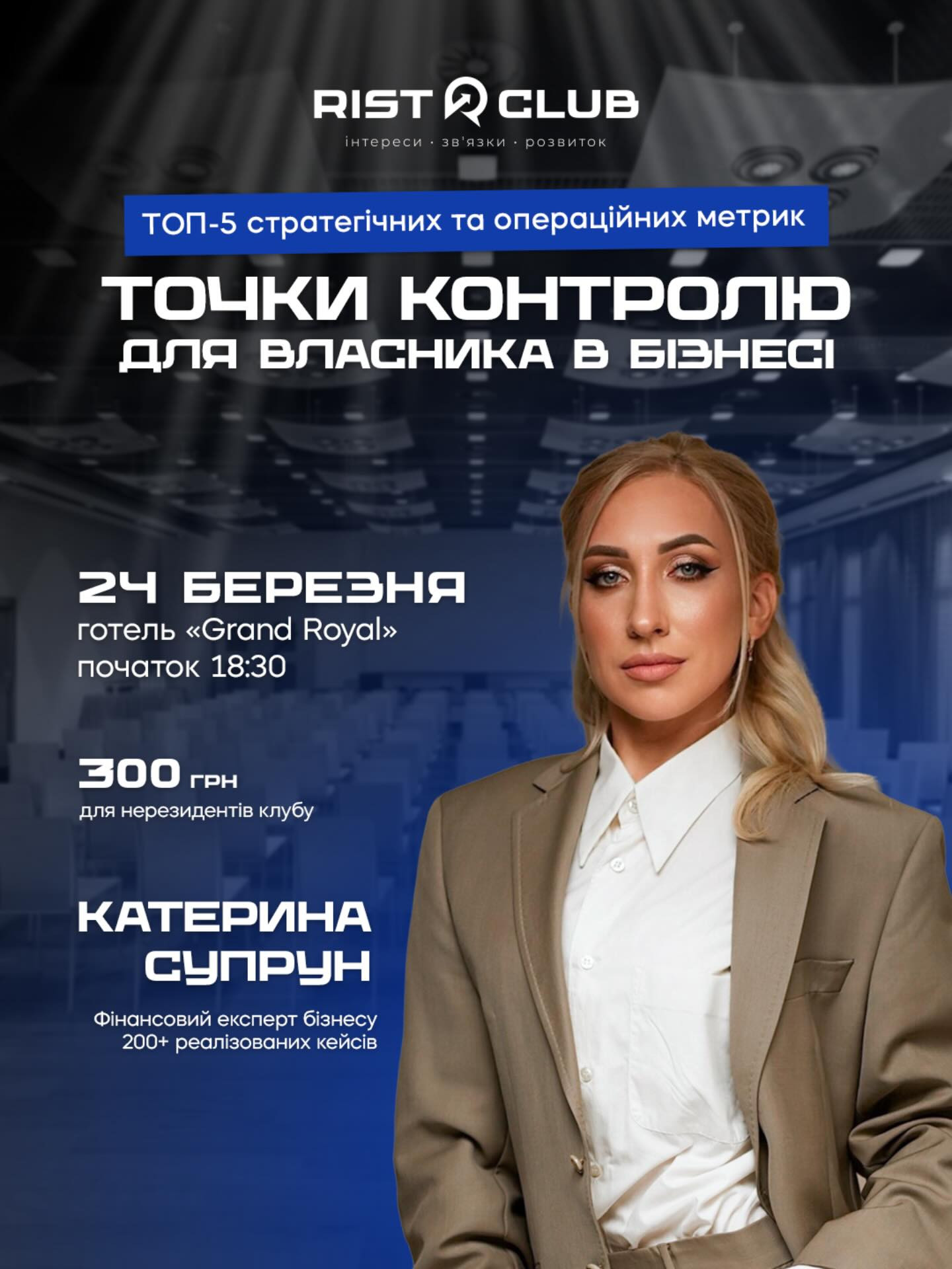 Запрошуємо на зустріч із Катериною Супрун - фінансовою експерткою з бізнесу та власницею консалтингової компанії з побудови управлінського обліку та фінансових систем для бізнесу.