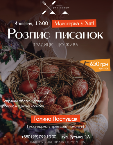 Писанкарство - традиція, яка передається з покоління в покоління. І вже 4 квітня у Ресторації ми проведемо майстерку, щоб ви могли доторкнутись до неї особисто.