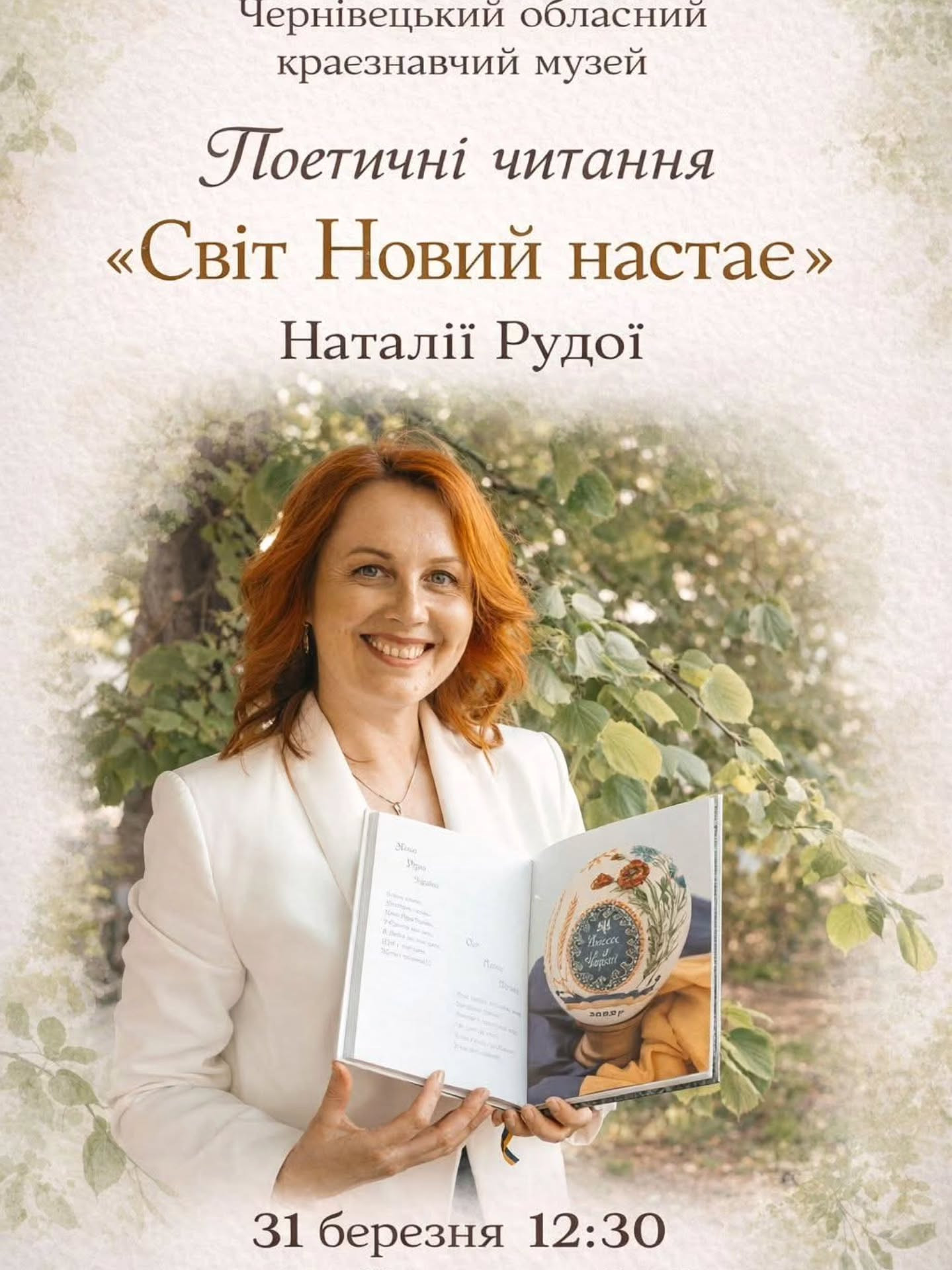 31 березня у Чернівецькому обласному краєзнавчому музеї відбудеться тепла й натхненна зустріч із поезією Наталії Рудої.