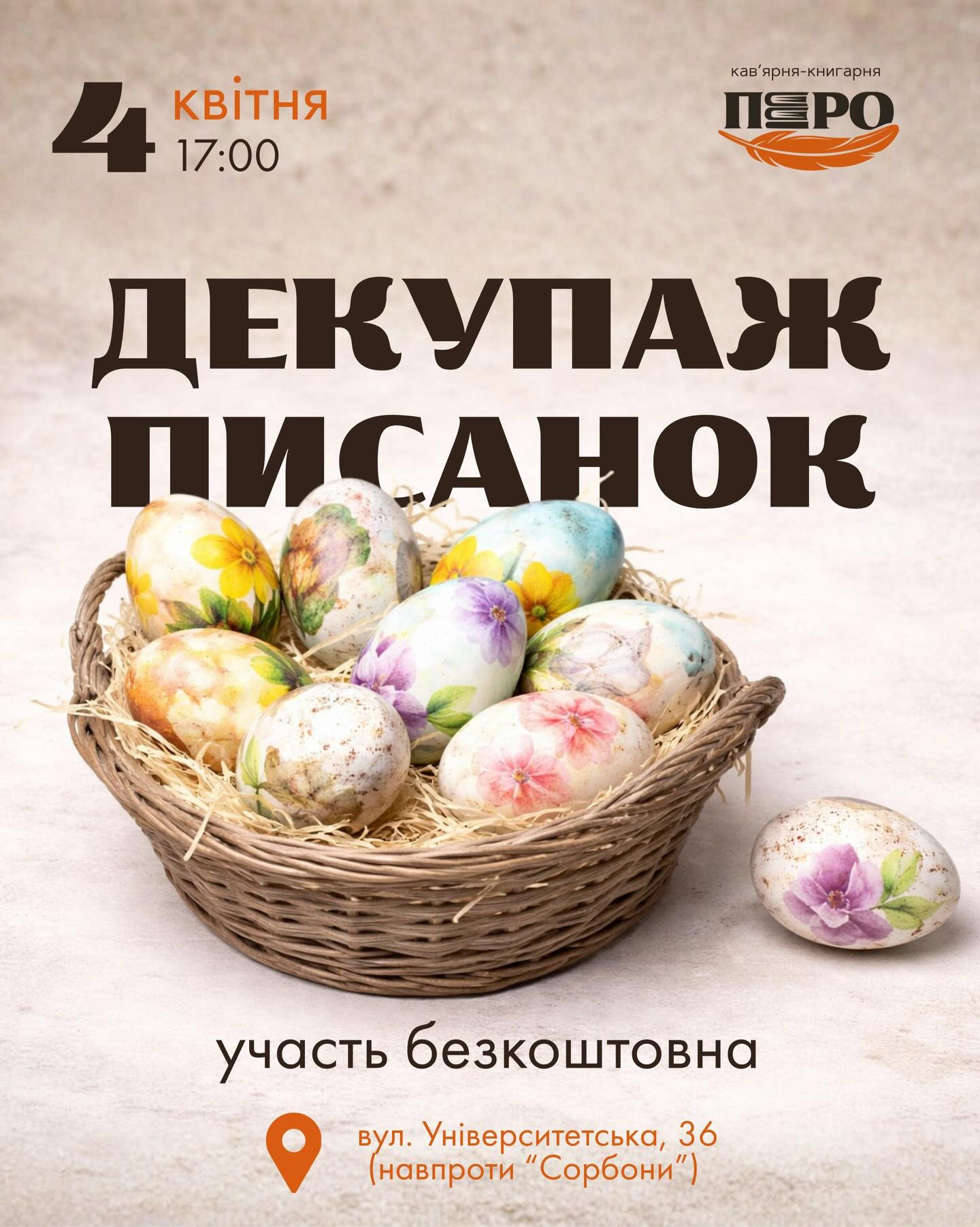 Кав’ярня-книгарня "Перо" запрошує на майстер-клас із декупажу писанок. Разом будемо працювати з ніжними візерунками, переносити їх на писанки та створювати унікальні святкові прикраси.